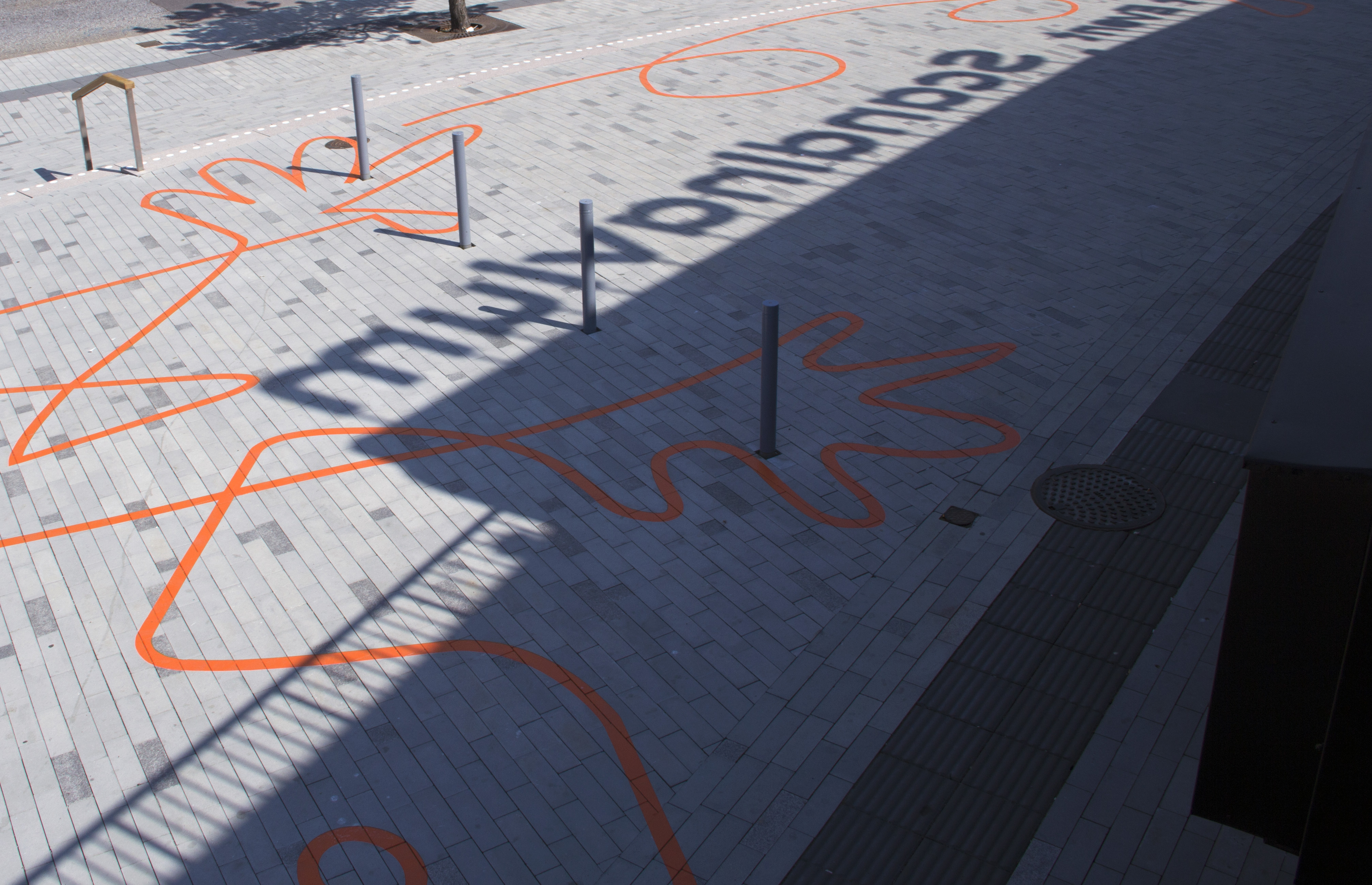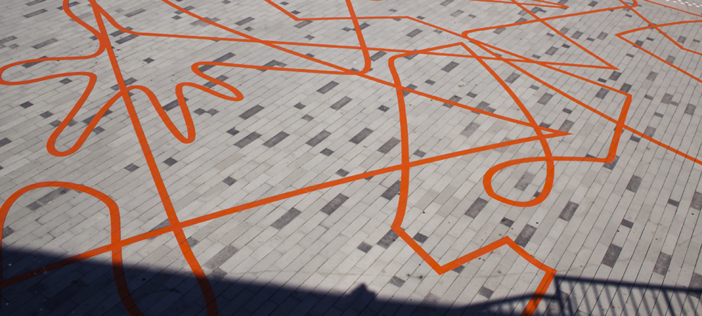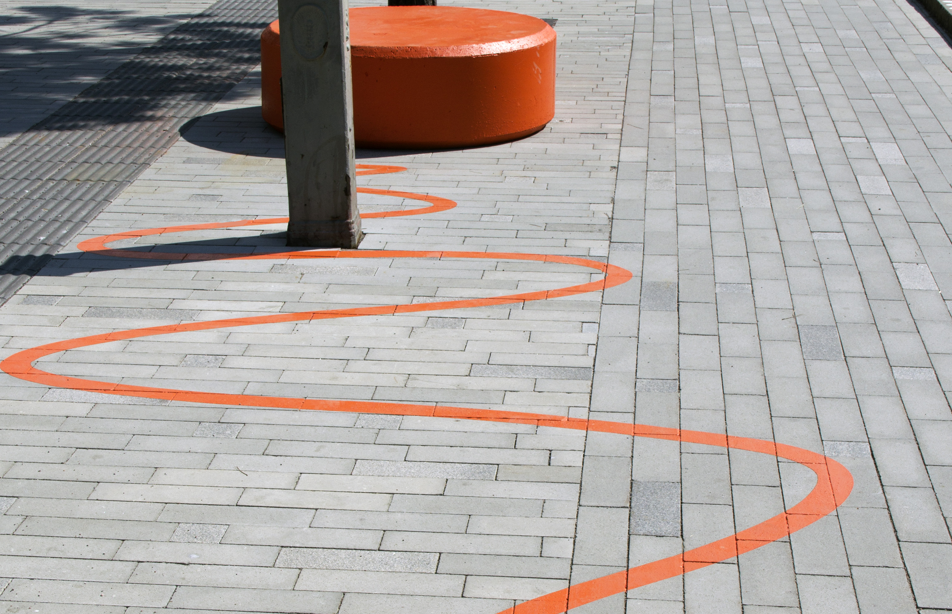 You have recently installed your public commission ”A Line” outside the event arena Scandinavium here in Göteborg. The work consists of an unbroken line in orange that winds over a fairly large surface area. The line is painted in the kind of paint that is used for street markers. Can you tell us a little bit about your ideas behind the work?