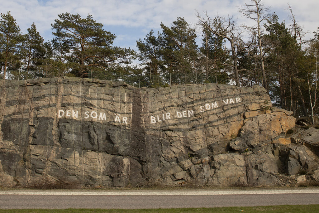Konstgestaltningen sträcker sig även utanför kulturhuset. På en bergvägg längs Bergsjövägen syns orden ”Den som är blir den som var” inristade. Orden är tagna ur en dikt skriven av poeten och spoken word-artisten Elias Abi Jaber.