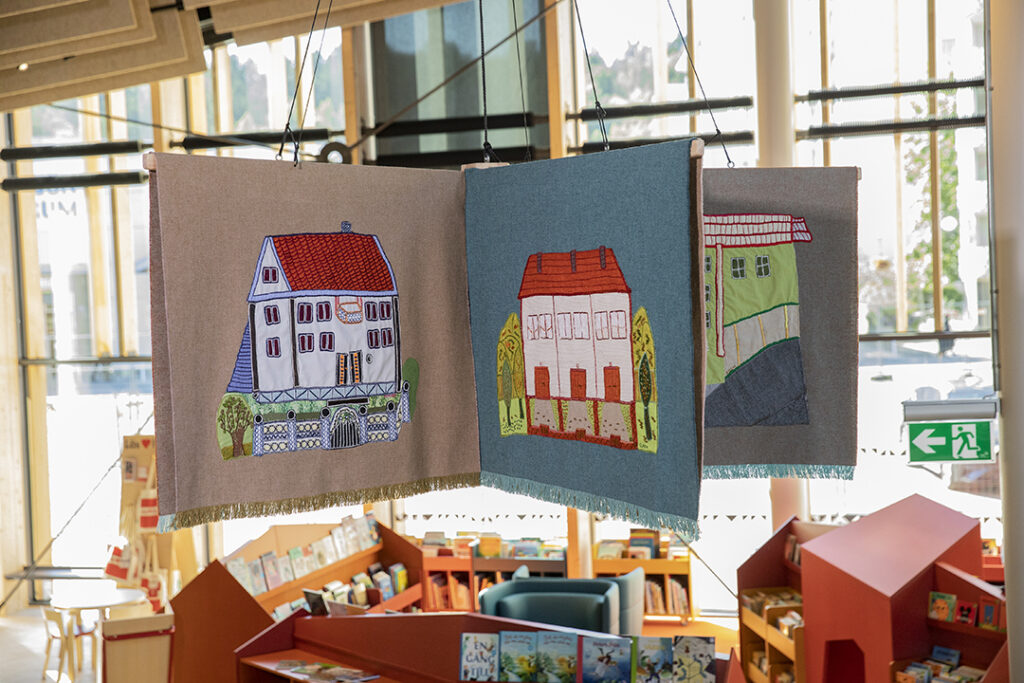 Strax intill, ovanför kulturhusets ”berättartrappa”, svävar textilkonstverket Hus i hemlandet. I verket har en grupp kvinnor från Kvinnocenter i Bergsjön, alla med flyktingbakgrund, broderat de hem som de en gång har tvingats lämna bakom sig.