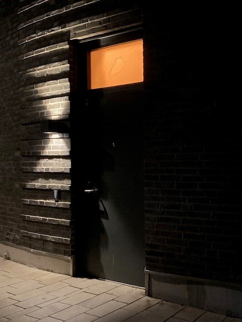 – ”Centrum” består av ett videoverk som visas bakom ett bakvänt titthål på en av Jubileumshusets ytterdörrar. Ovanför dörren har en glasruta lagts till som ett lager i det befintliga fönstret. I den har konturerna av kartan från Göteborgs första stadskärna skurits ut. Varje skymning tänds ett brandgult sken genom rutan samtidigt som videoverket sätts i gång bakom dörrögat.