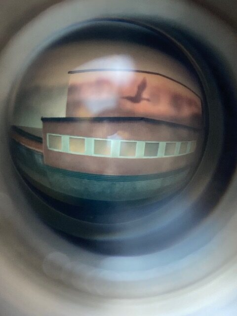 – Båda bilderna, den i fönsterrutan och den bakom dörrögat, visar förgångna framtidsvisioner. Eftersom byggnaden heter Jubileumshuset har jag tänkt mycket på Göteborgs bild utåt och jubileets framtidsanda och tillbakablickande.