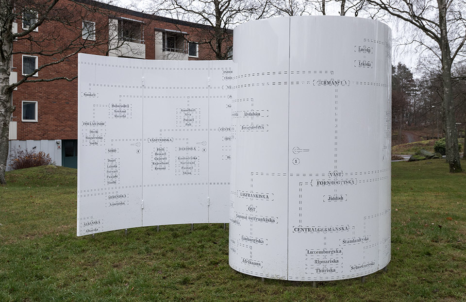 Verket består av totalt nio paneler i en spiralform, gestaltade som dörrar med handtag och lås. Spiralformen i konstverket bygger på principen om det gyllene snittet. Den vitlackerade ytan täcks av en schematisk översikt, ett språkträd, över de ännu levande och utdöda indoeuropeiska språken och dess språkstammar. De utdöda språken är överstrukna.