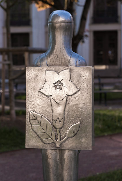 Går du in i parken från Avenyn möts du av kvinnan med blomsterplakat. Blomman liknar en tobaksplanta och hon står på en stubbe märkt med årtal som refererar till händelser i parken. 1764 avled tobaksfabrikören Andreas Damm. Han ägde då en 13,5 tunnland stor tobaksodling där Lorensbergsparken ligger idag. Ungefär 1825 omvandlades platsen till en park för allmänheten. 1916 stod Lorensbergsteatern färdig. 27 oktober 1963 spelade The Beatles på Lorensbergs cirkus på sin första utlandsturné.