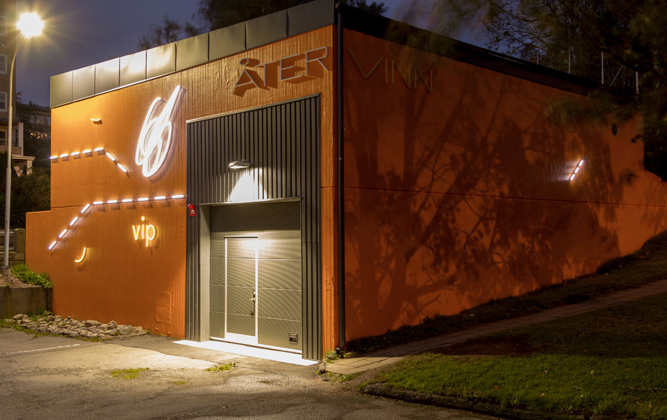 Pulserande neonsymboler i ett kvällsmörkt bostadsområde i Rannebergen. Är det en bar eller kanske en nattklubb? De blinkande orden Åter och Vinn avslöjar byggnadens verkliga funktion.