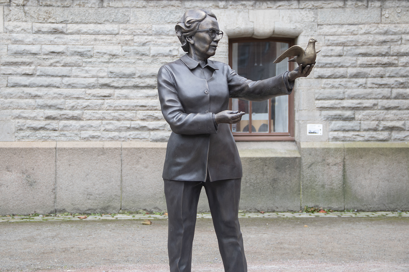 Utanför Samhällsvetenskapliga biblioteket står Ingrid Segerstedt Wiberg, förkämpe för mänskliga rättigheter – rakryggad och med en fredsduva i handen.