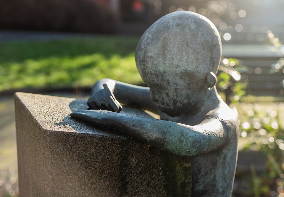 Vid en granitpelare står flickan på tå med en penna i handen, för att nå upp att skriva på pappret hon har framför sig. Samtidigt sitter pojken med ryggen mot samma pelare, helt uppslukad av den bok han har i knät. Bredvid pojken står duvan, lugnt betraktande pojken.