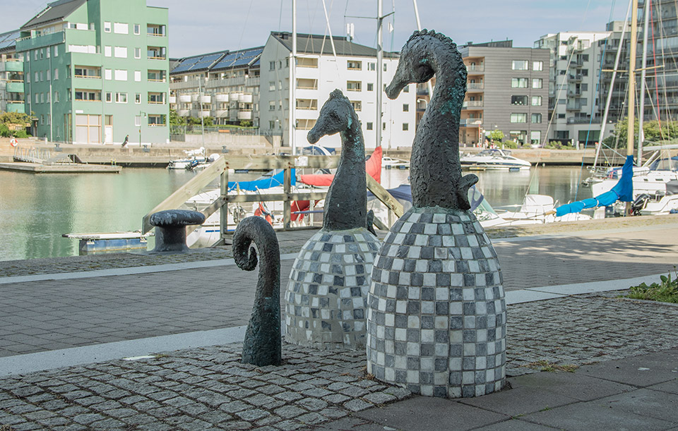 Längs promenadstråket vid Sannegårdskajen finns en konstgestaltning i fyra delar som alla på något sätt har med havet och sjöfart att göra. Tillsammans bildar de en slags visuell berättelse. Den fjärde delen sett från hamnkanalen kallas ”Sjöhästar”.