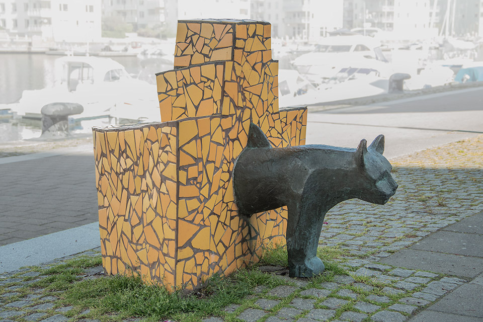 Den kakelklädda formen föreställer stäven på ett fartyg ur vars inre en katt tränger sig fram och står där stadigt med sina framtassar på marken. Katten är gjord i brons, medan stäven är klädd i gult kakel. Kanske handlar skulpturen om en skeppskatts öde?