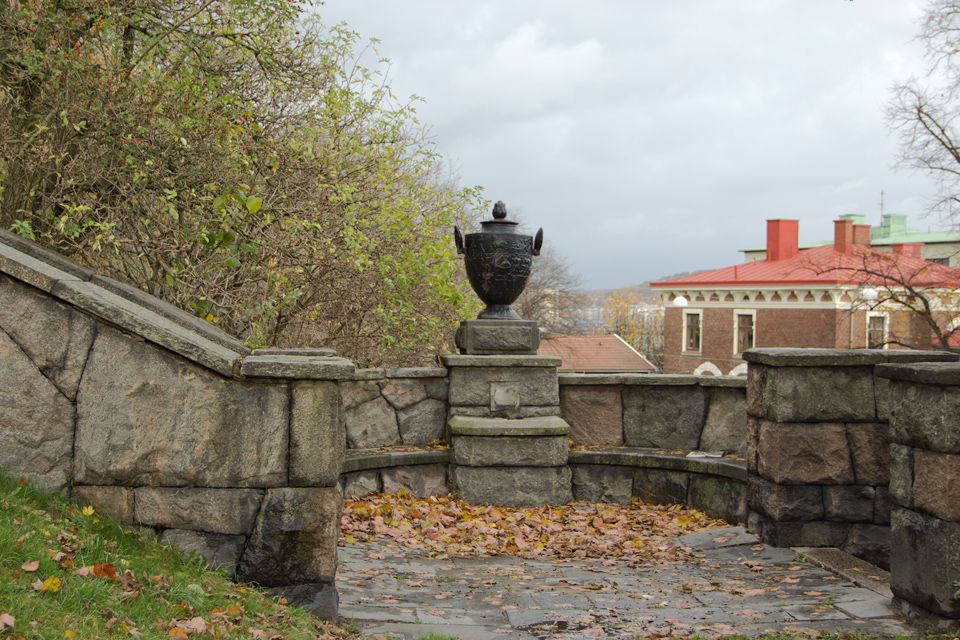 På Allmänna vägen mitt emot Karl-Johanskyrkan skapades omkring år 1920 en lek- och viloplats åt stadens invånare. Ett par år senare kompletterades platsen med denna urna i gjutjärn, gjuten 1921.
