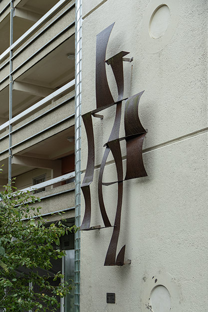 Uppe på den vita väggen syns tunna bitar av brun corténplåt i olika abstrakta former. Men det är inte plåtbitarna som visar bladformerna, utan här dyker bladen upp utanför och mellan verkets delar. ”Mellanrummen” har på så sätt en lika viktig roll som själva verkets form.