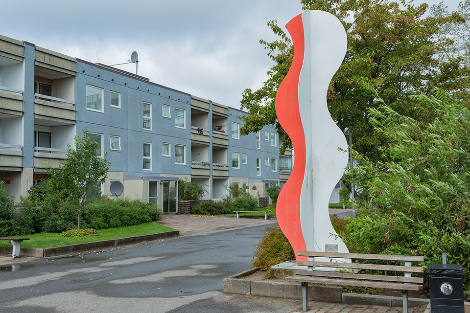 Som ett färgstarkt, vågformat utropstecken står Olle Langerts skulptur lysande i vitt och rött på Oxelgården i Gårdsten.