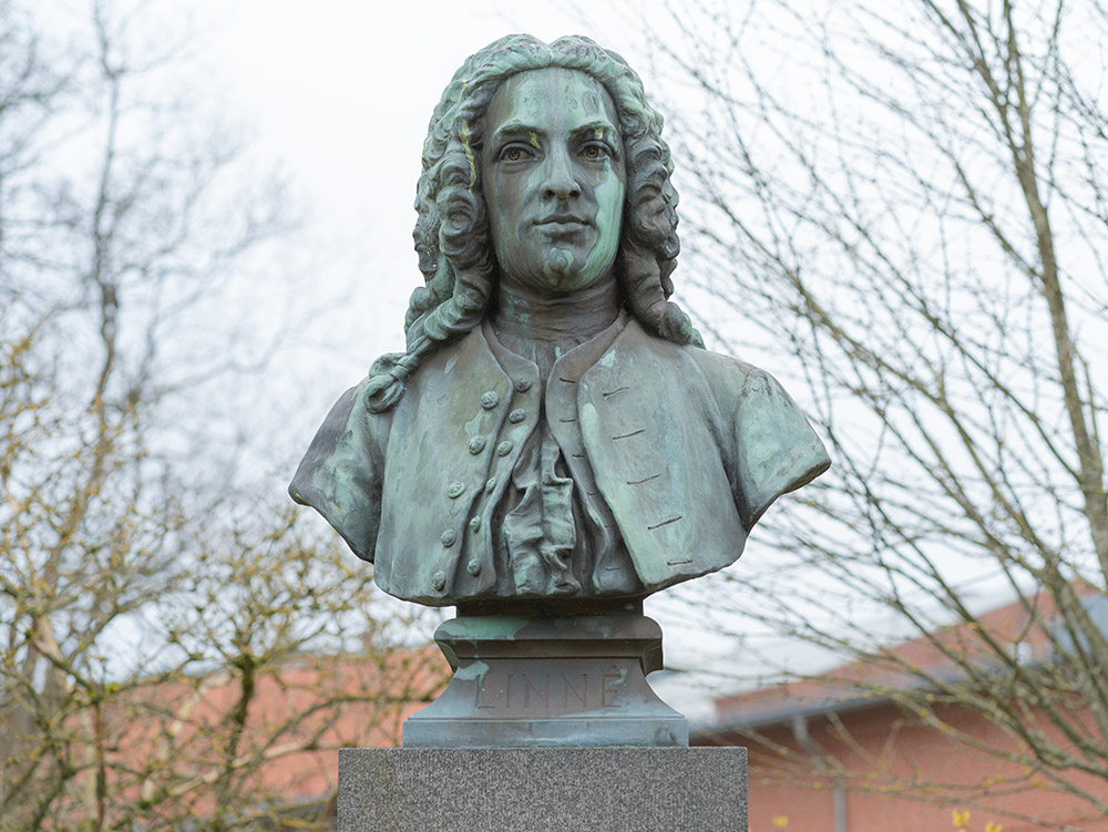 Strax innanför Botaniska trädgårdens entré står den svenska botanikens fader Carl von Linné staty.