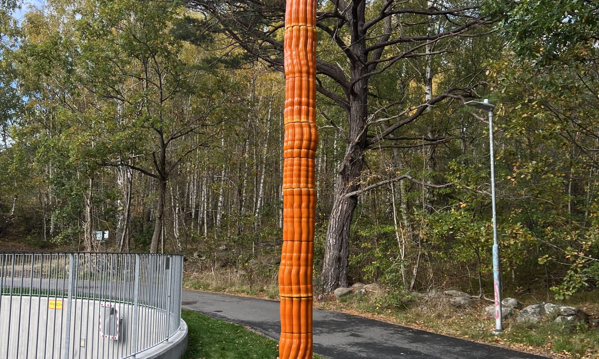 En orange pelare sticker ut i ett bostadsområde nära Askimsbadet. Nästan fem meter hög reser den sig från marken som ett utropstecken.