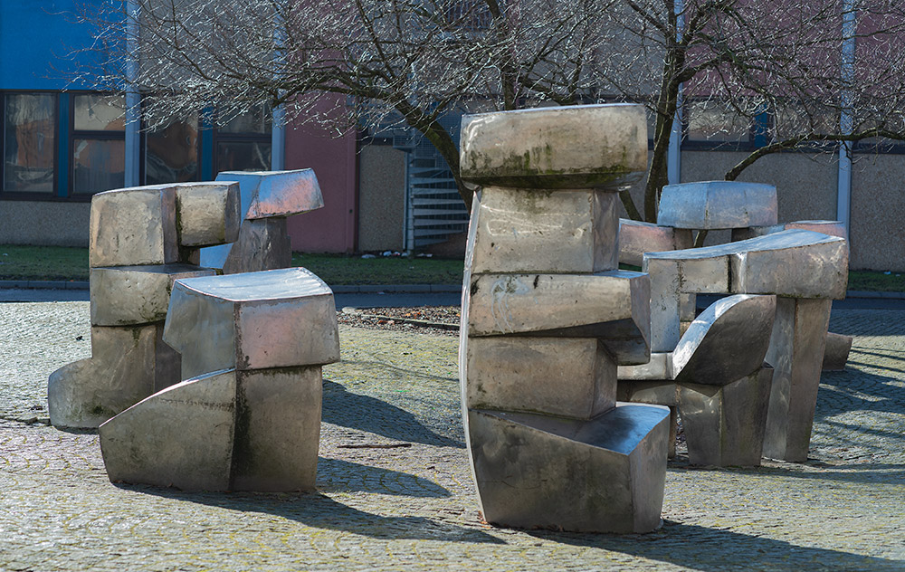 I material och form skiljer sig Lars Peterssons konstverk däremot väsentligt från sin förlaga. I stället för de resta eller liggande stenbumlingar som finns i en verklig domarring, ser vi en slags frusen lek eller dans bestående av ett antal kubistiskt inspirerade figurer i rostfritt blänkande stål.