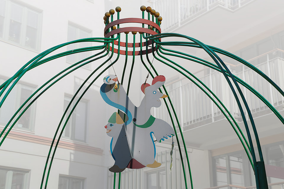 Spaljén är skapad av grönlackade böjda metallrör som avslutas i toppen med en slags krona. Ner från spaljéns överdel hänger en lustig figur med gul fågelnäbb och en röd tuppkam. Från vänster kikar en mindre rödnäst figur med en gulgrön hatt fram.
