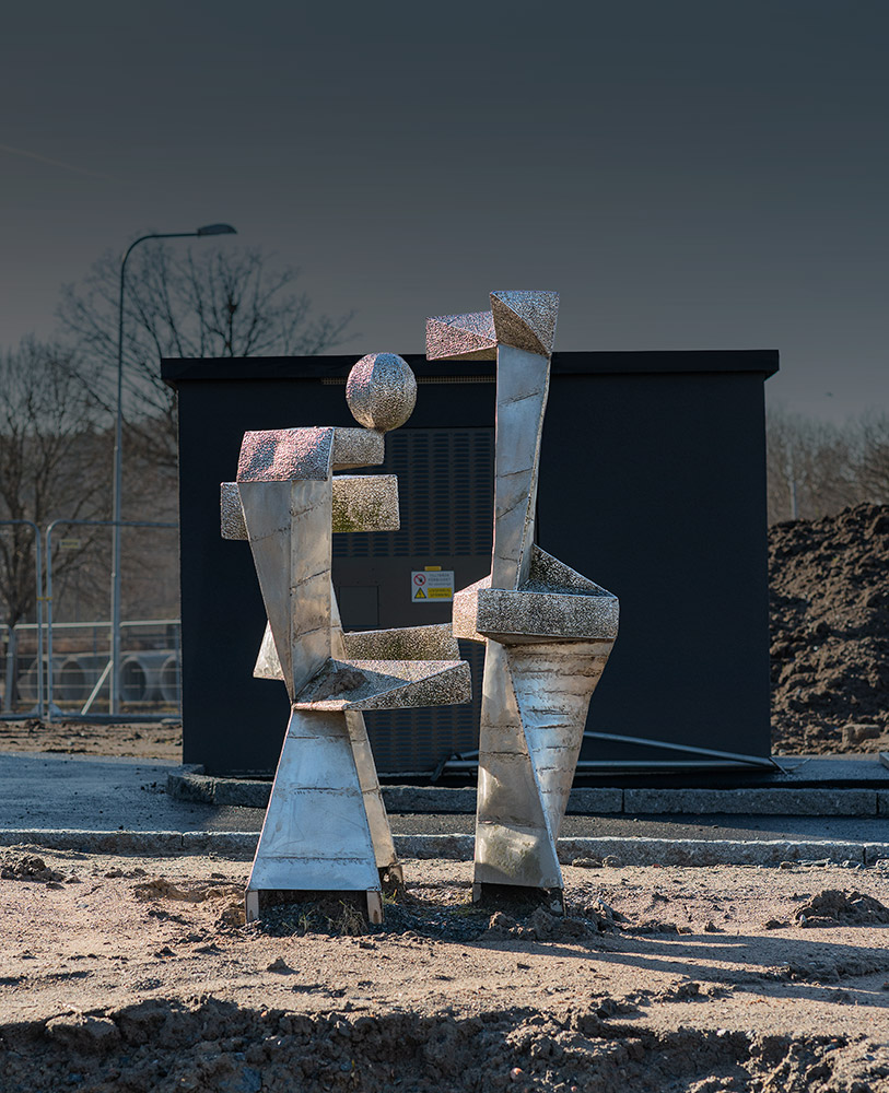 I skulpturgruppen har konstnären velat bryta materialets ytstruktur genom att skapa en slags ”knottrig” yta, kanske med hjälp av en svets? På så sätt skapas en dynamik mellan verkets olika ytor och delar.