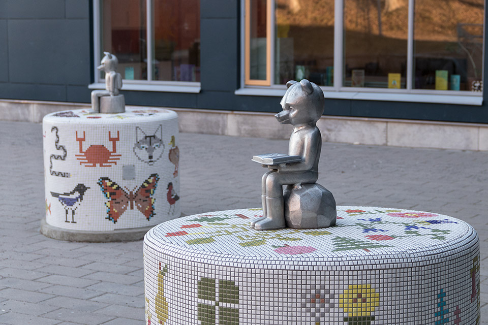 På varsin rund mosaikklädd sockel ser vi två mindre figurer i omålad aluminium. Bägge figurerna har människokropp men huvudformen får en att tänka på en björn och en räv. Den ena figuren har en bok uppslagen i knät, medan den andra sitter och betraktar omgivningen med sin ryggsäck på ryggen.