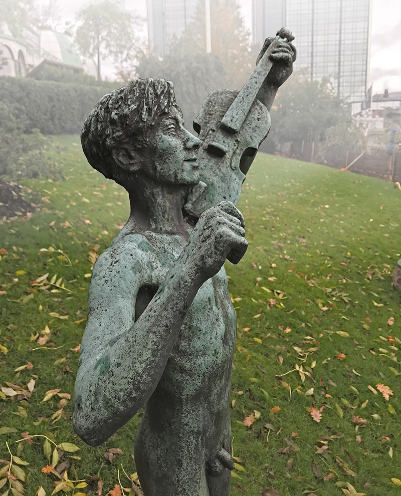 En ung man med huvudet lätt bakåtböjt och till synes helt inne i musiken han frammanar, står sedan 1946 på gräsmattan strax innanför Lisebergs huvudentré, spelande på sin fiol.
