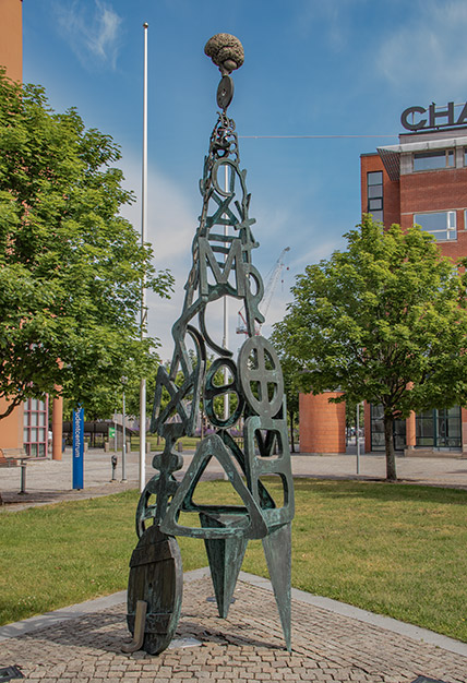 Mitt i Kunskapscentrum Lindholmen står ett fem meter högt torn, bestående av bokstäver, symboler, två hjul och geometriska former. Högst upp tronar en mänsklig hjärna.
