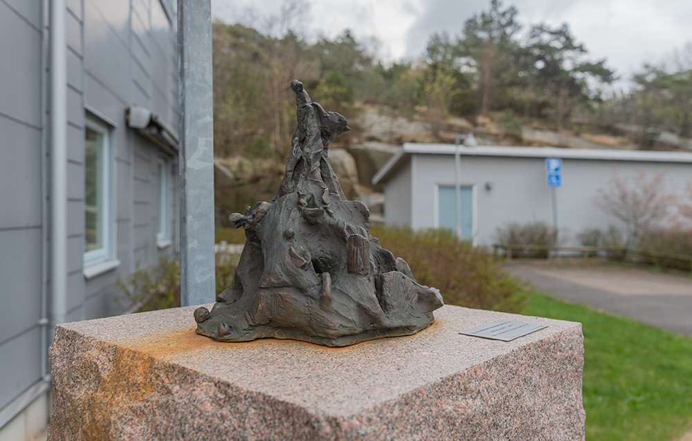 Denna lilla skulptur placerad framför entrén till ett bostadshus i Västra Frölunda kan ses som ett politiskt inlägg om den svåra bostadssituation som råder för många unga människor idag.