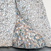 Med hjälp av mosaik har skulptören Pål Svensson skapat detta abstrakta verk. Mosaiken är lagd på ett sätt som gör det möjligt att ana en rörelse som både går inåt och utåt.