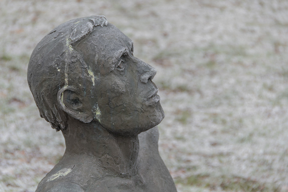 Titeln Mannen och trädet kanske väcker frågor hos någon. Figuren på sockeln ett par meter upp i luften ser ju ut att vara en abstrakt tolkning av mannen på gräsmattan snarare än ett träd. Är det sig själv han betraktar?
