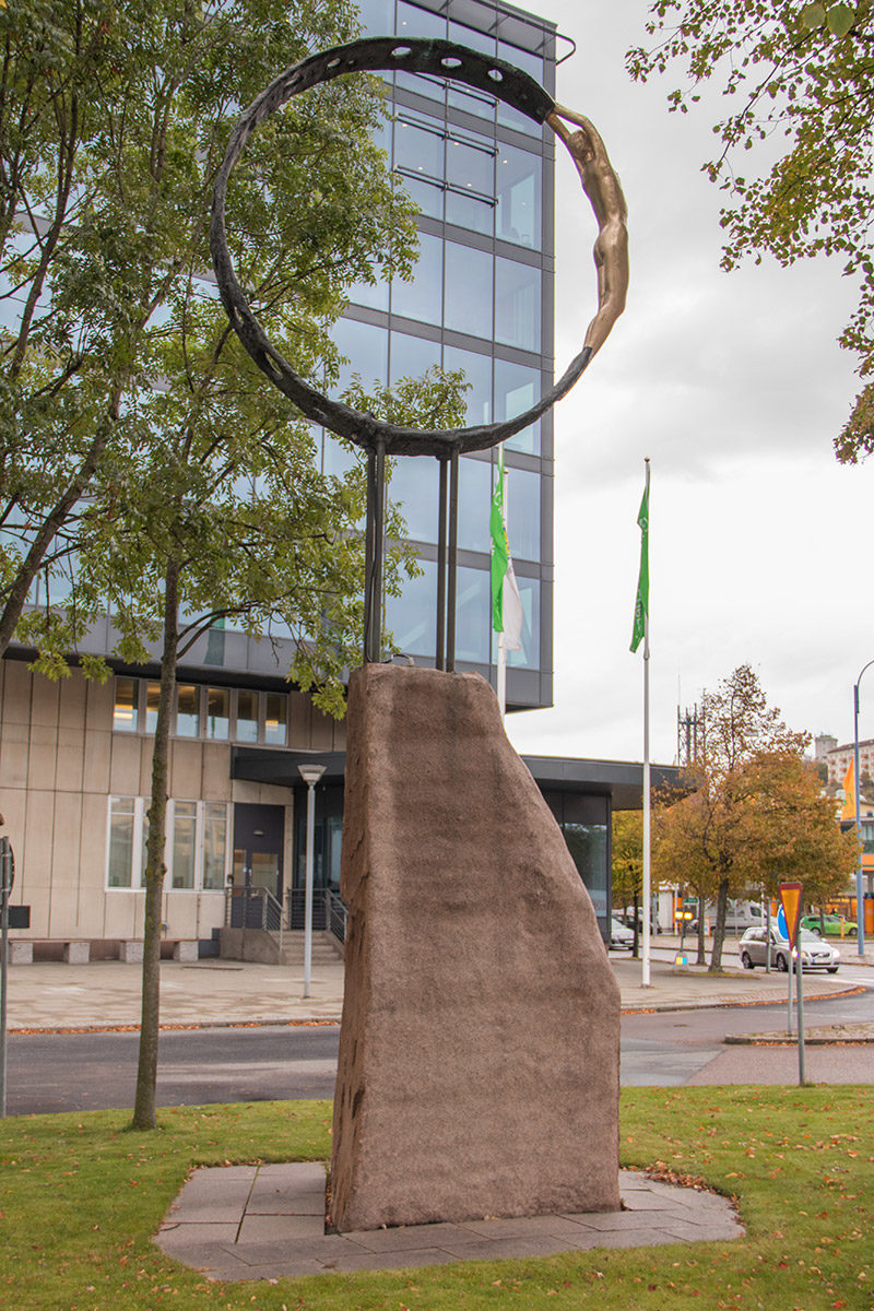 Skulpturen Månskäran består av en cirkelrund form i mörkt patinerat brons varav en fjärdedel utgörs av en blank bronsfärgad kvinnokropp.