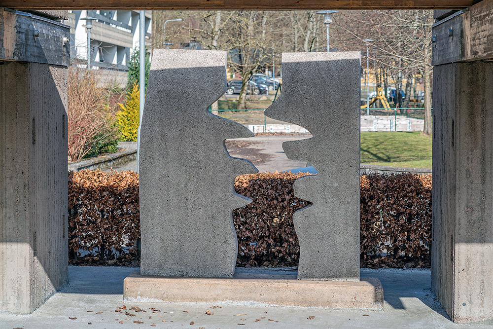Verket består av två betongblock, som ser ut att antingen ha glidit isär eller är på väg att sammanfogas till en helhet, nästan som två pusselbitar.