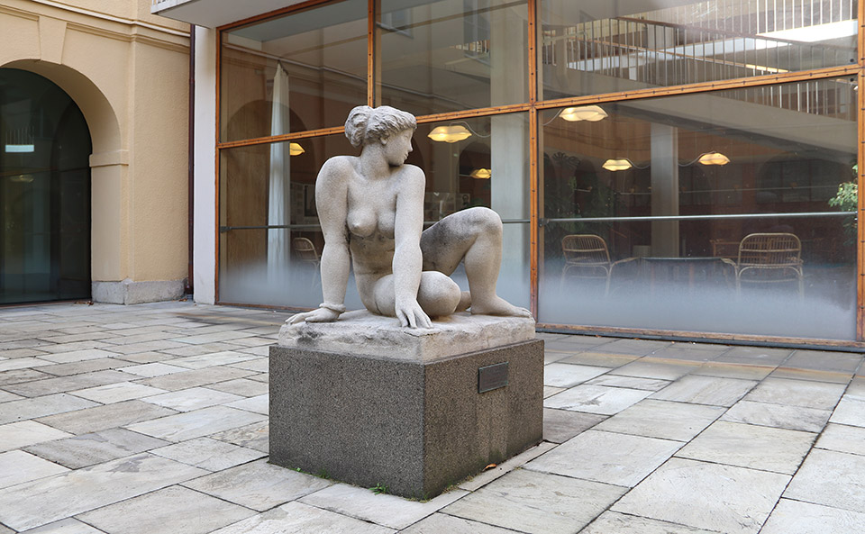Skulpturen kan endast betraktas från insidan då gården inte är öppen för allmänheten.