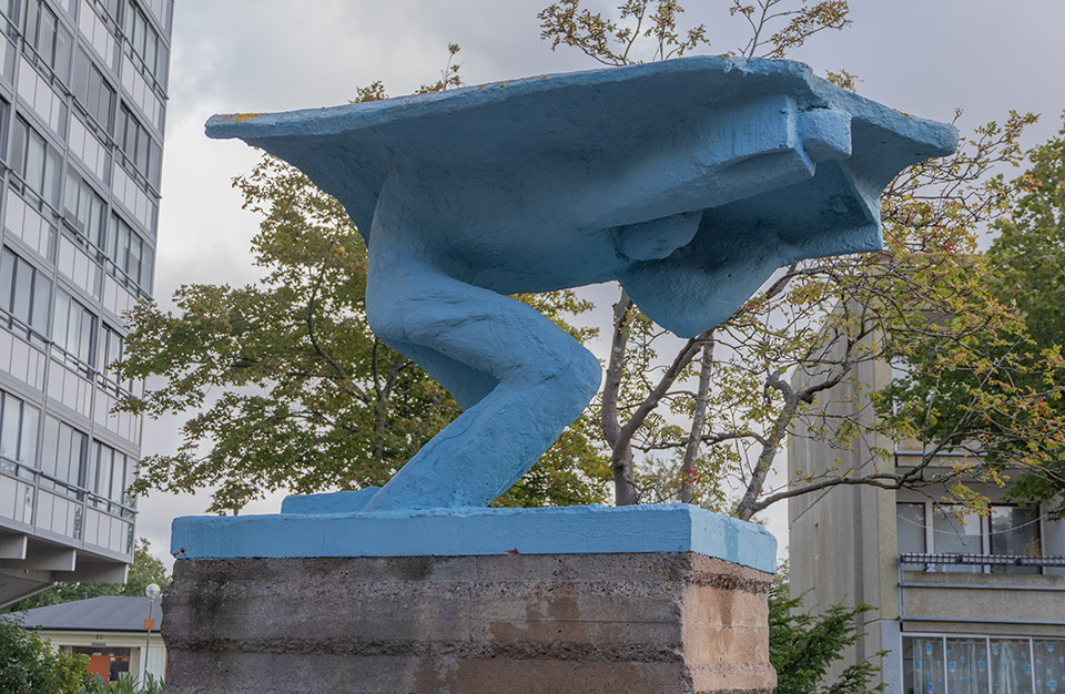 Nästan två meter upp på en sockel står en blå figur med lätt böjda ben och händerna greppande ett stort segel. Det är svårt att avgöra om figuren kommer att lyfta eller tryckas ner mot marken när hen väl tar språnget ut.