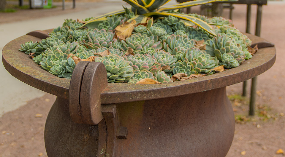 I en halvcirkel vid Bältespännarparken i Göteborg står fem av Sivert Lindbloms kända urnor i gjutjärn.