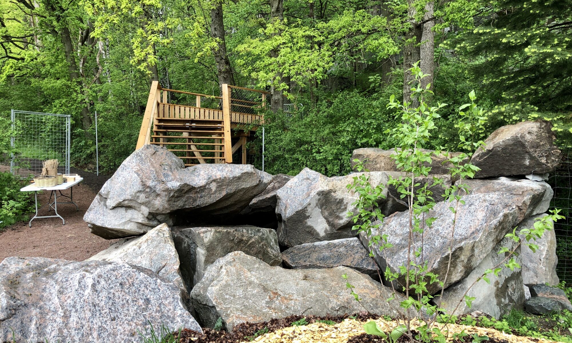 Vid bergsmassivet vid sidan av en skogsträdgård i Fjällbo park syns ett stenras, som letar sig in i trädgården och övergår till anlagda blockstensmurar. Här står stenrasets oordning i kontrast med trädgårdens ordnade ytor och odlingsbäddar.