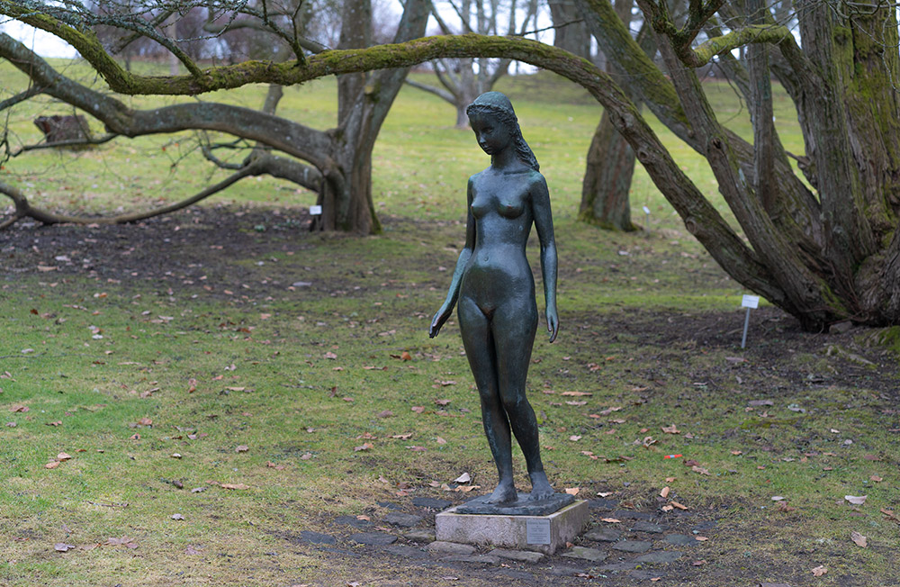 En bit in från gången som löper genom Botaniska trädgården möter man denna mytologiska kvinnogestalt i brons, föreställande skogens härskarinna.