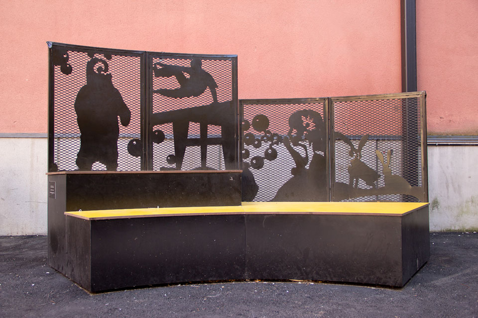 Skulpturen är både ett konstverk, en scen och en sittplats. Färgsättningen har anpassats till det gula och svarta i Backateaterns byggnad.