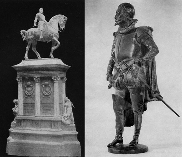 Som syns i skissen av ryttarstatyn ovan tillkom bland annat en hjälm och en mer rustningslik klädsel i den färdiga statyn. Dessutom förändrades proportionerna så att kungen till häst blev mycket större i förhållande till postamentet.