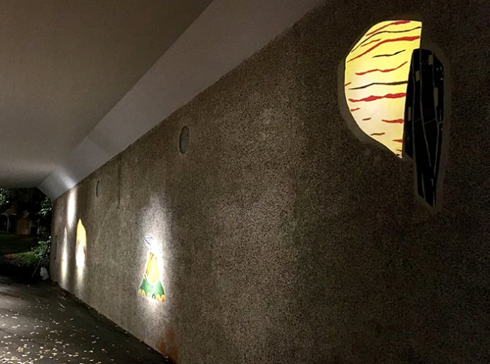 Gångtunneln vid Fjällviolen, som förbinder busshållplatsen och Vättleskolan med bostadsområdet, har med konst och ljus förvandlats av konstnären Marie Dahlstrand till en ljusare och tryggare plats.