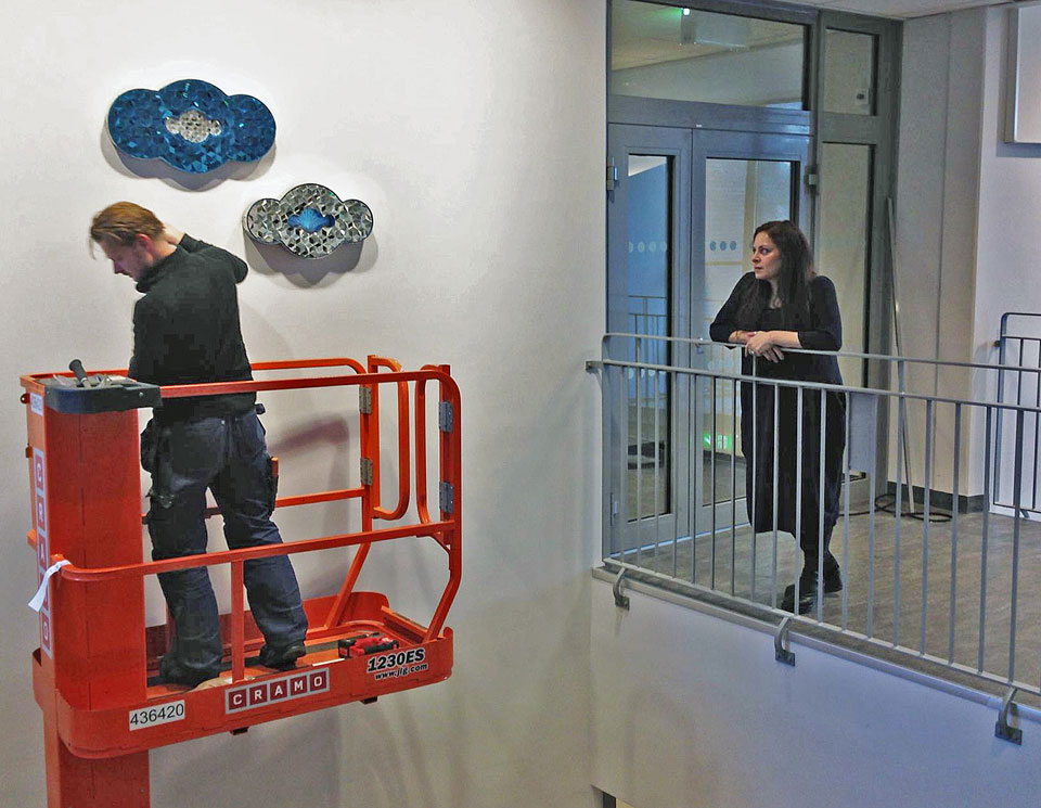 Konstverket består av tre objekt, klädda i mosaik av spegelglas, som placerats på hög höjd i trapphuset vid entrén. Vid en första anblick påminner de om två moln och ett upp och nedvänt nyckelhål. Verket är en del ur serien Underlandet. Göteborg Konst ber här Mandana att dela med sig av sina tankar kring konstverket och om att arbeta konstnärligt i offentliga miljöer.
