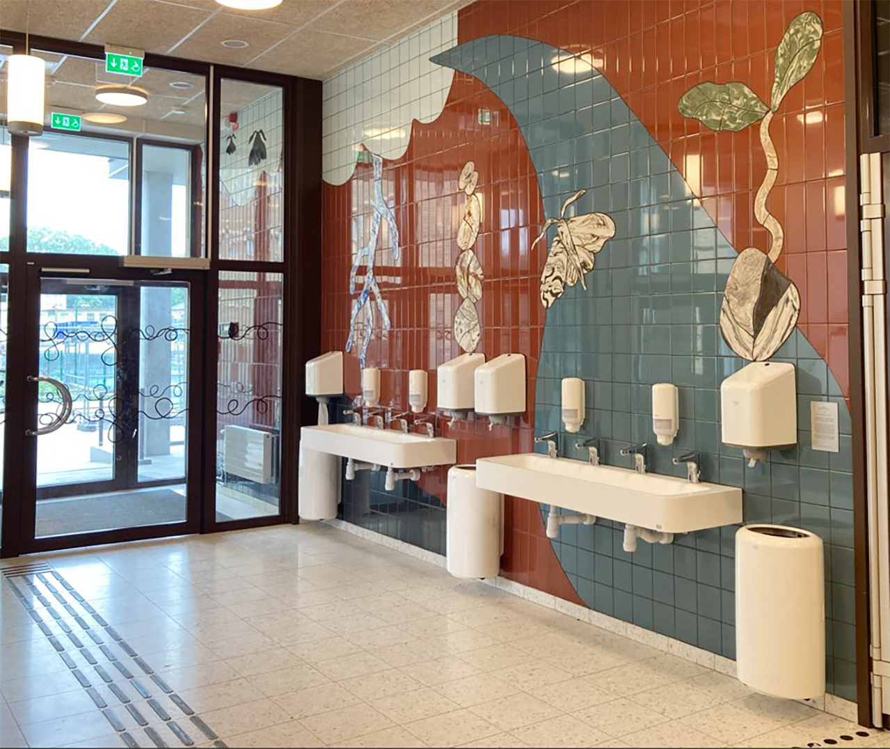 Gestaltning på vägg inomhus, Bräckeskolan. Finansiär och processledare genom enprocentregeln: stadsfastighetsförvaltningen.