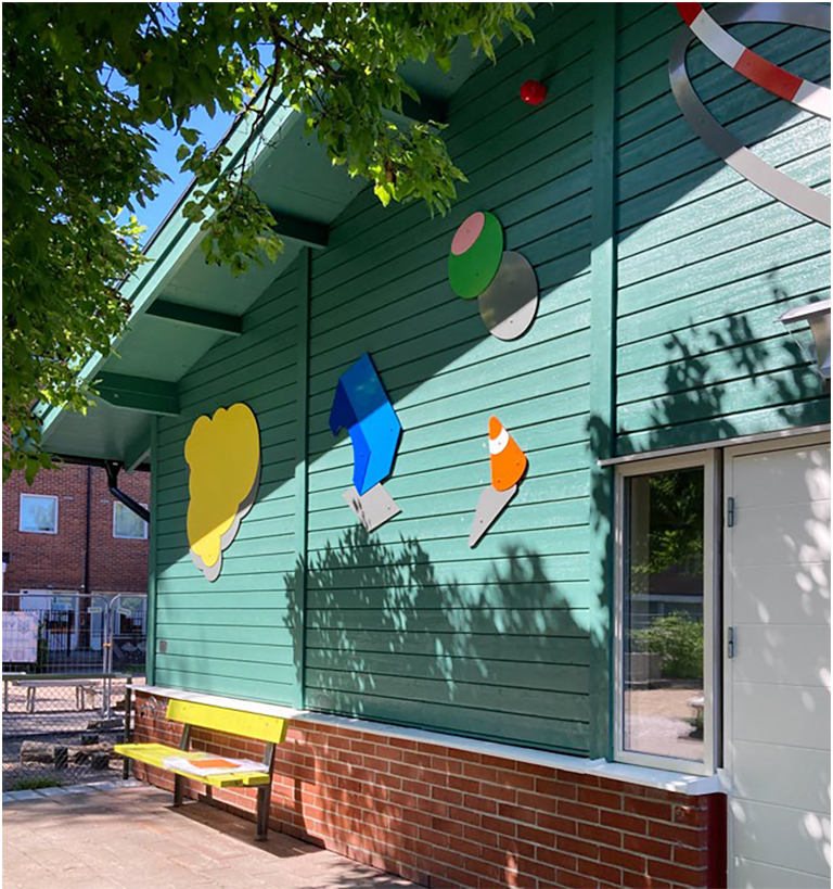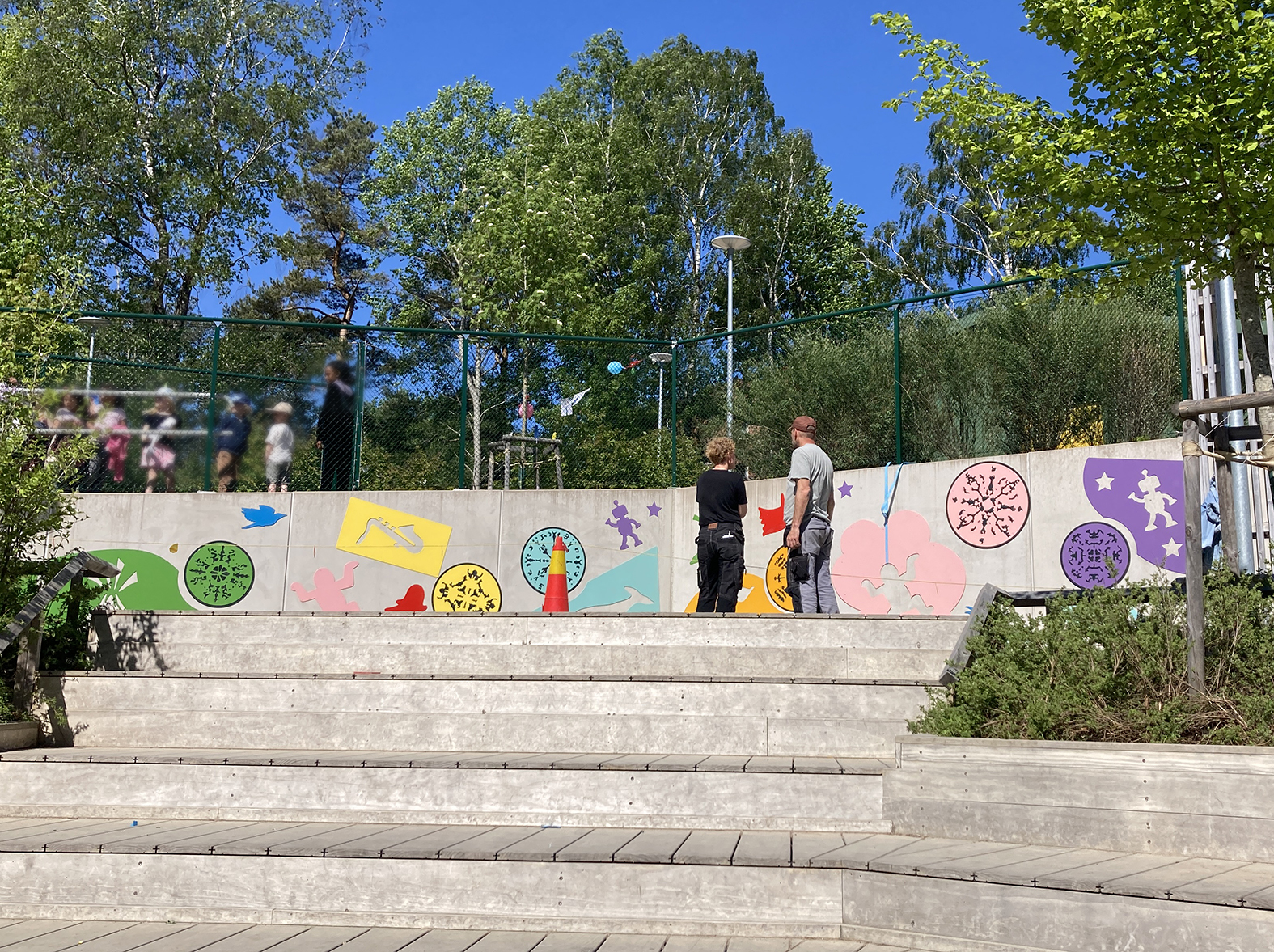 Gestaltning på stödmur, Orkestergatans förskola. Finansiär och processledare genom enprocentregeln: stadsfastighetsförvaltningen.