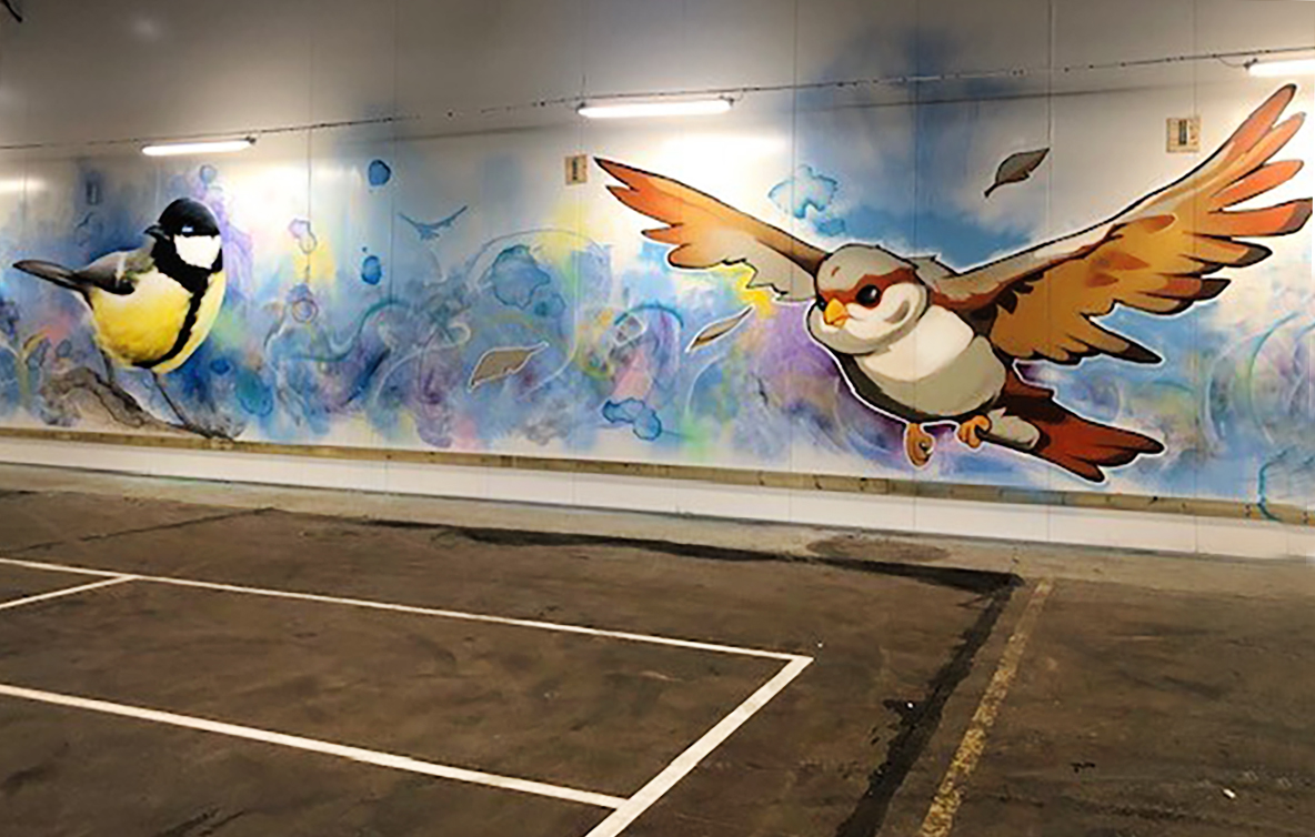 Muralmålning i P-hus Centralen. Finansiär och processledare: Göteborgs Stads Parkering.