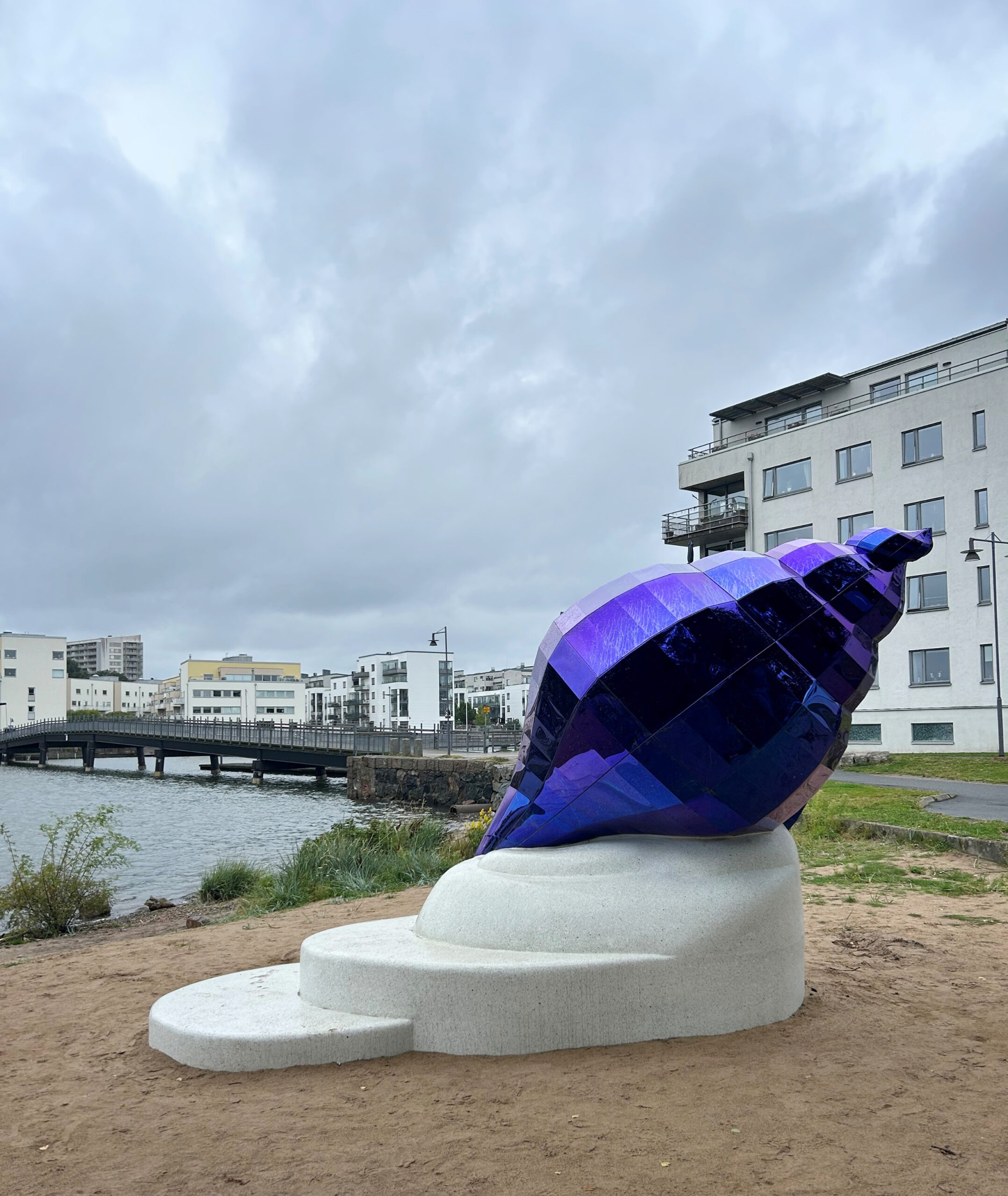 En iögonfallande lila snäcka står på stranden vid Miraallén (Sannegården) på Hisingen, som om den spolats upp från havet.