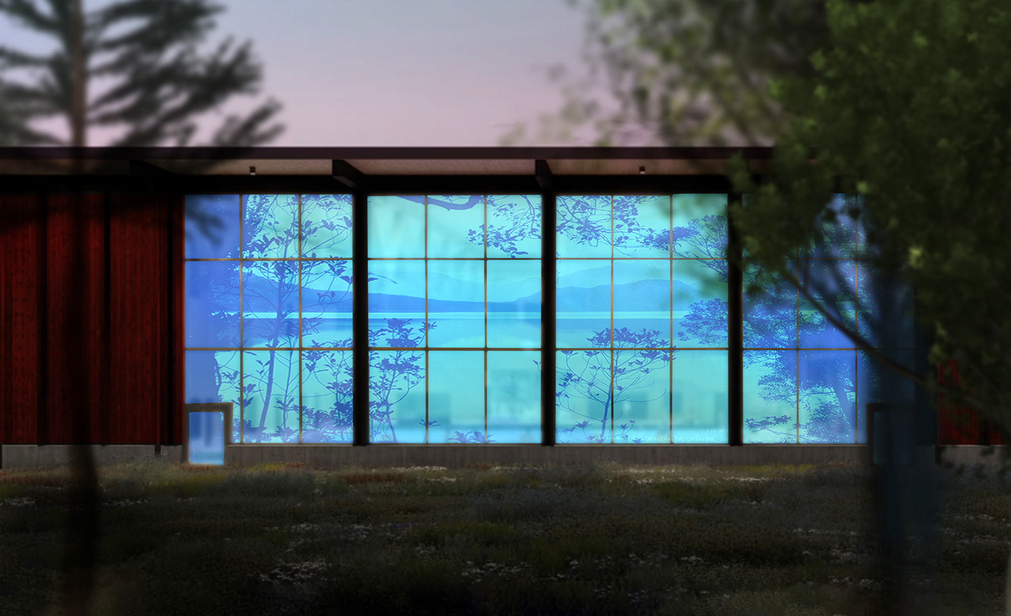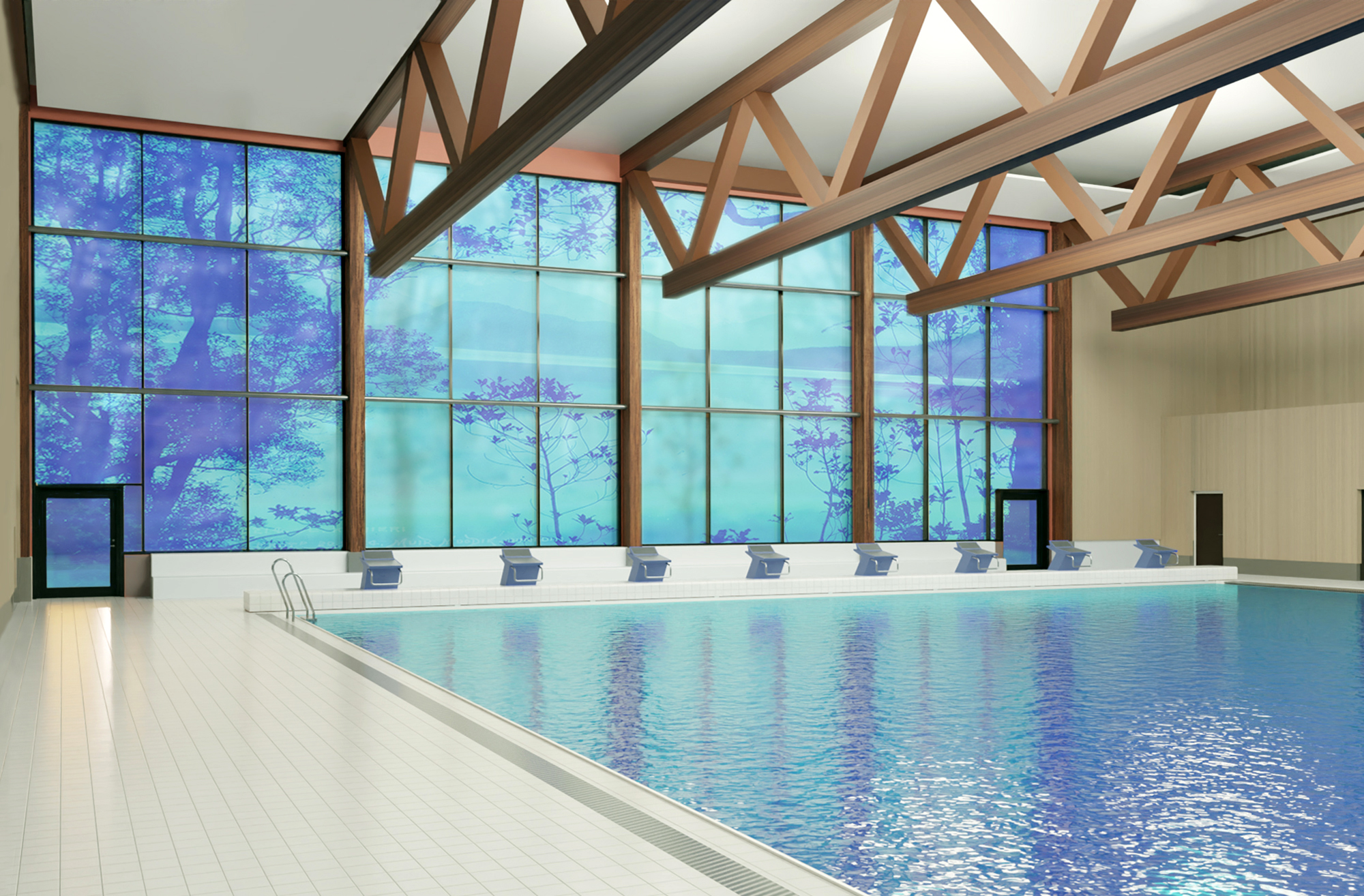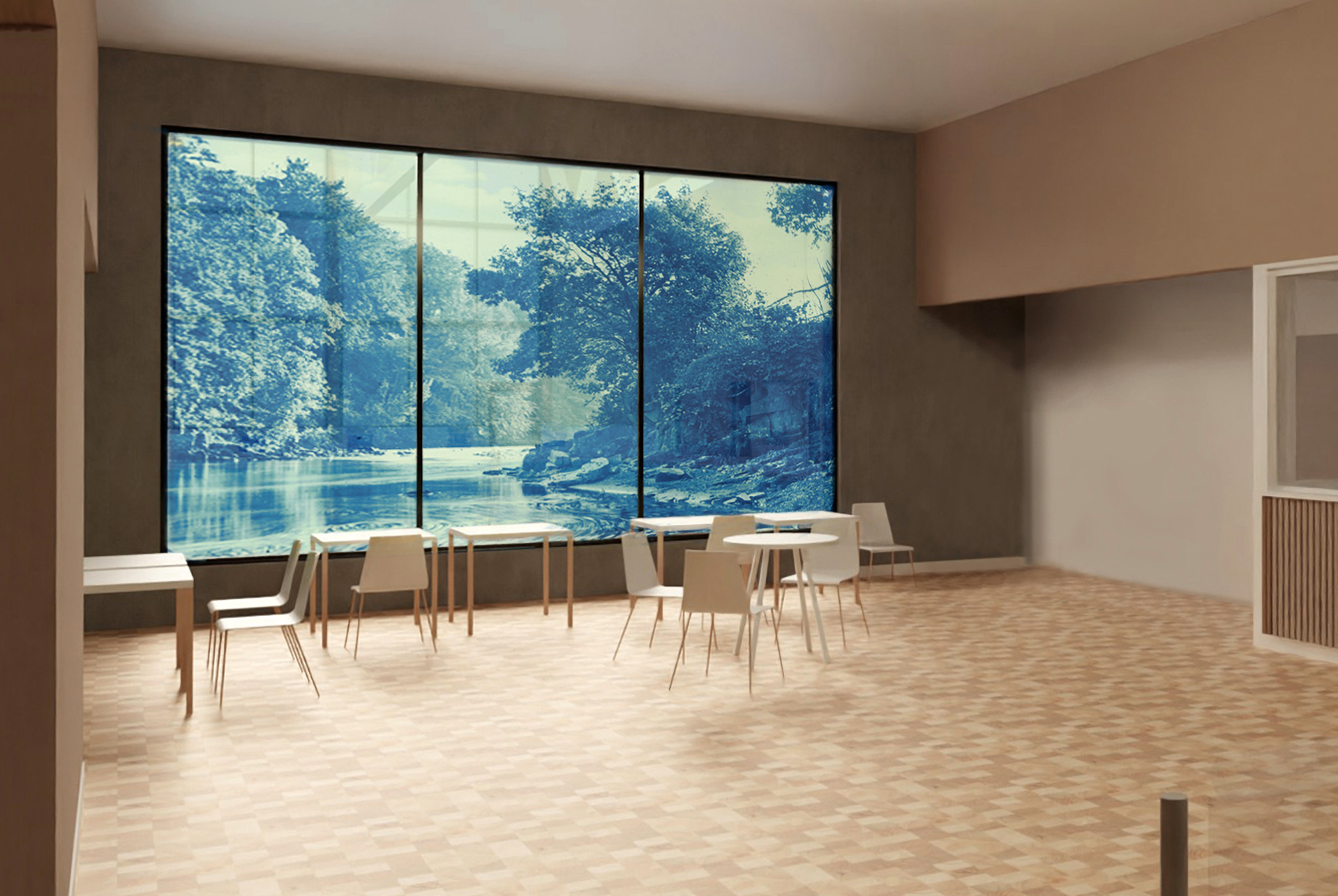 I de bearbetade landskapsfotografier från 1800-talet som trycks på glasen blir vattendrag en återkommande del av motivet. Det största trycket blir på fönsterväggen vid bassängen, där flera glas tillsammans bygger upp en vy med berg vid horisonten och växter i silhuett i förgrunden.