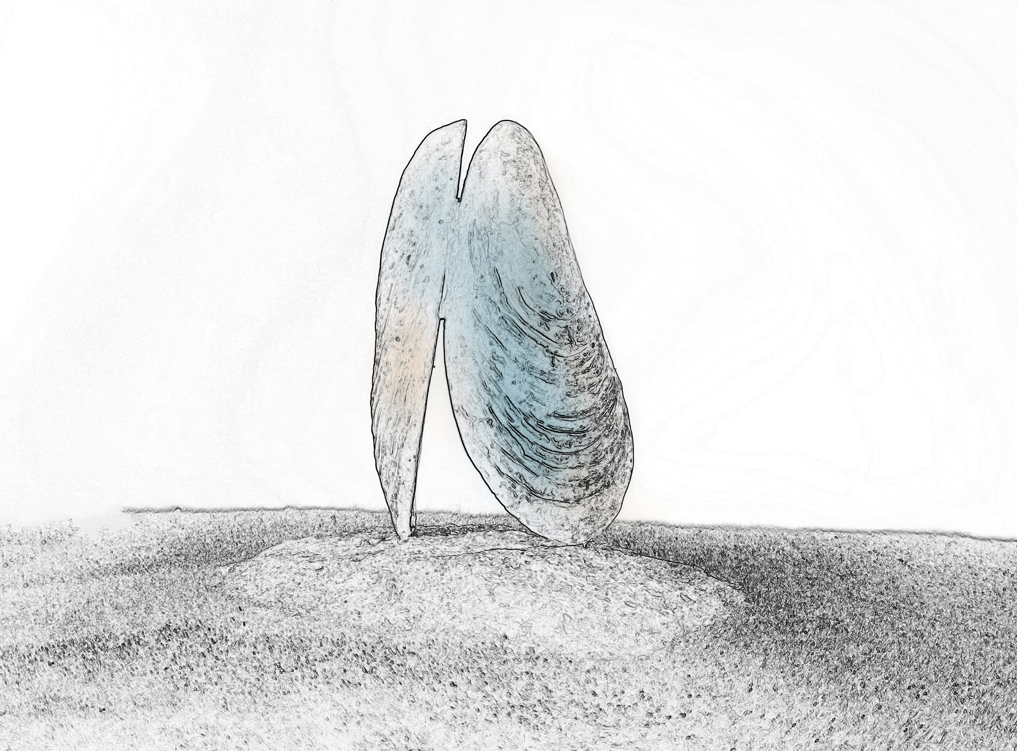 Vid gångstigarna upp mot simhallen ska rosa släta granithällar från Bohuslän placeras ut. Vid sidan av stigen kommer en bronsskulptur av en halvöppen blåmussla att stå, cirka en och en halv meter hög. Den har en polerad insida som reflekterar ett gyllene ljus när den på kvällstid belyses underifrån. På entrétorget placeras ytterligare ett liggande musselskal i brons.
