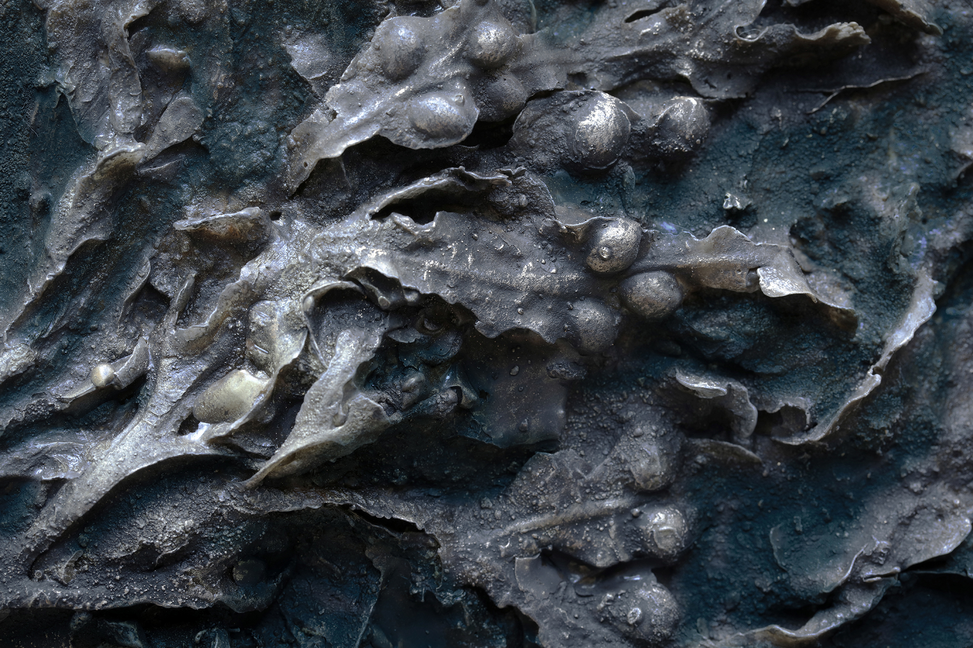 – För att återkoppla till det historiska perspektivet har jag också använt mig av en av de äldsta fotografiska metoderna för att trycka bilder, cyanotypi, i fotogram av vattenväxter på trä inne i simhallen. Där får solen framkalla avtrycket av till exempel tång på en bestruken yta. Men ljuset spelar även roll i bronsrelieferna längs väggen i korridoren där avgjutningar från bottnar i flod och hav speglas i fönstren mittemot, säger Anna Ekman.