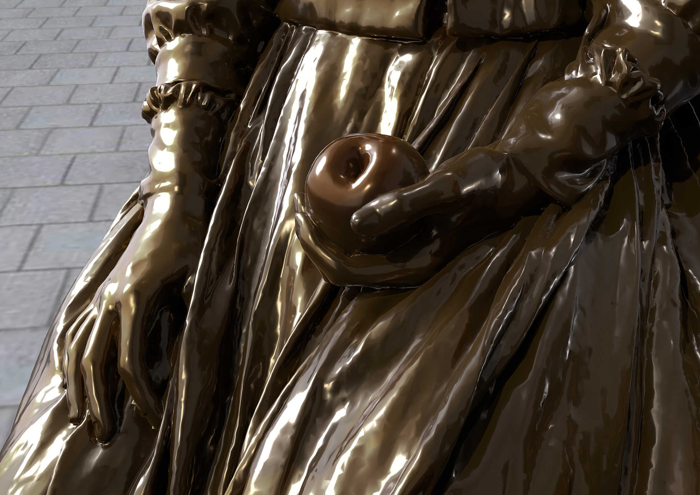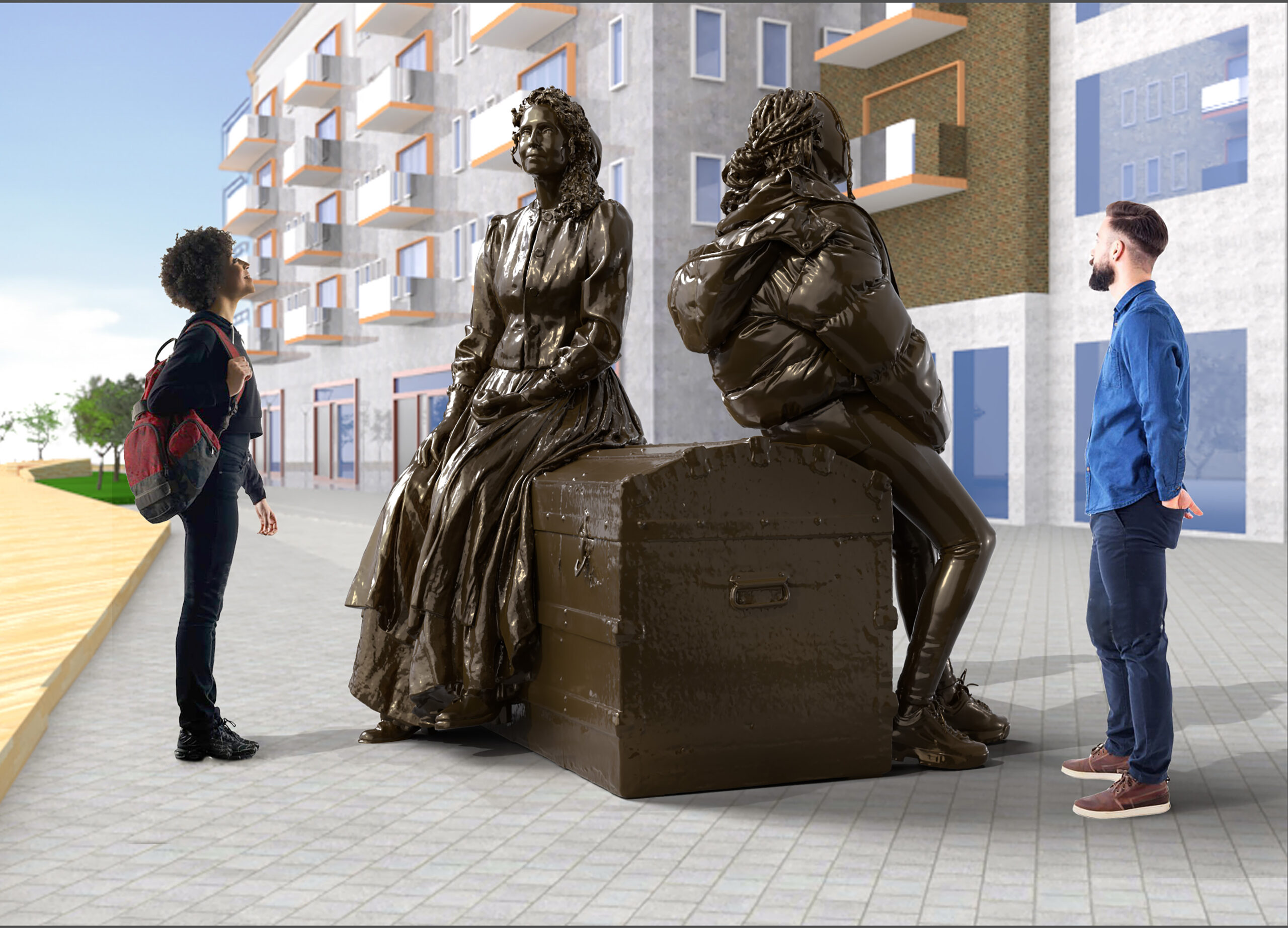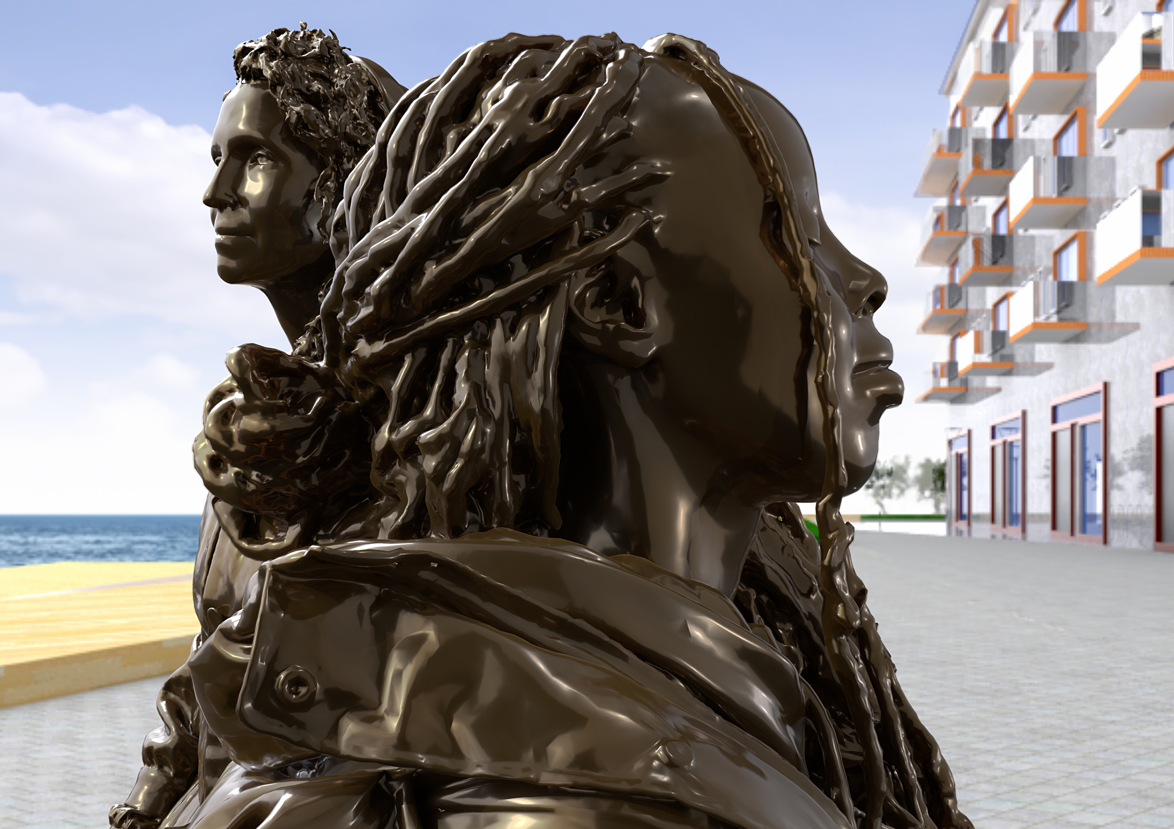 ”Att färdas på vatten i stället för jord” består av två kvinnliga gestalter från olika tidsepoker som lutar sig mot en Amerikakoffert. Den ena kvinnan blickar västerut, mot det okända landet på andra sidan havet. Den andra kvinnan är klädd i gympaskor och täckjacka. Hon sitter vänd mot staden, blundar och vrider ansiktet snett uppåt för att fånga solens värmande strålar.