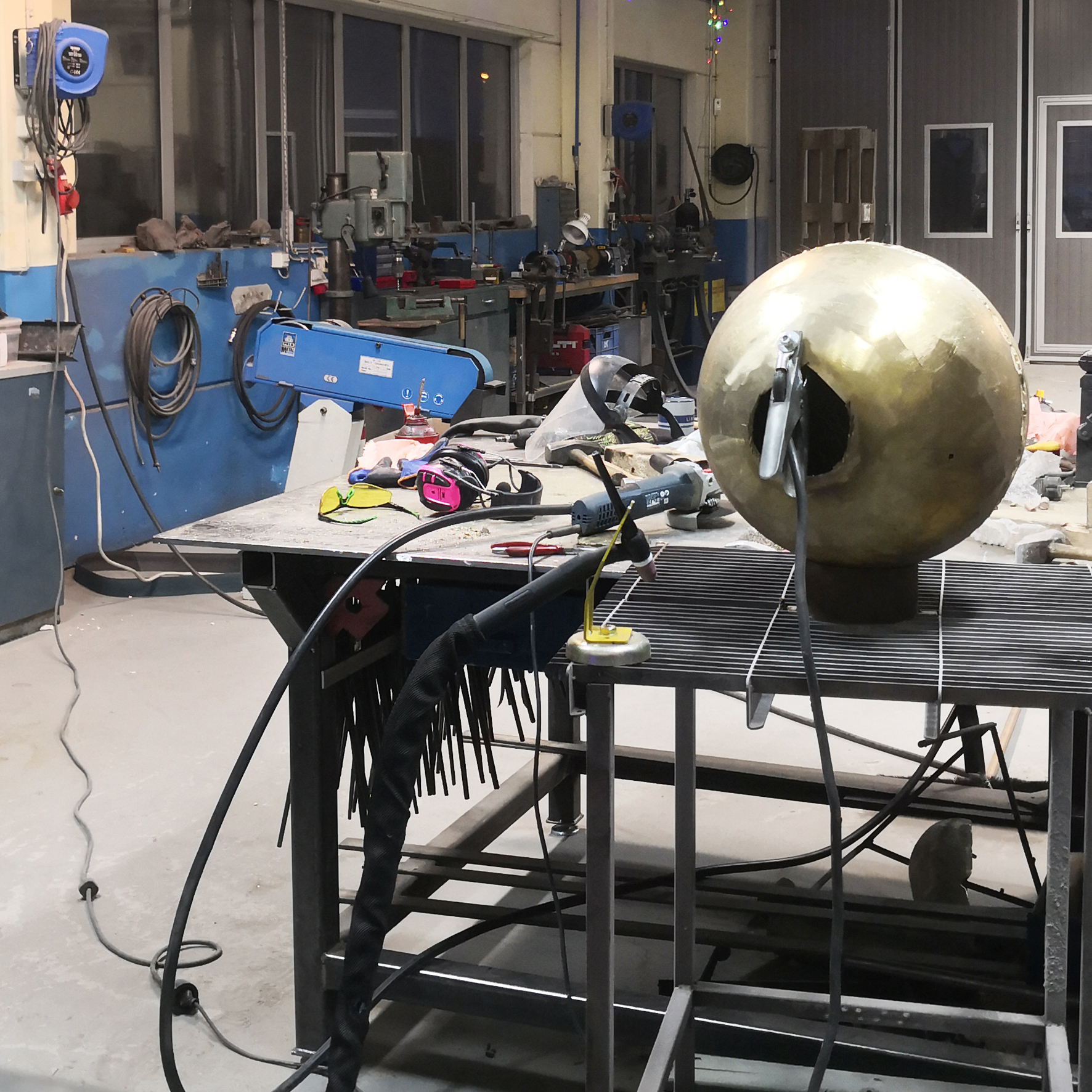 – Skulpturen är en slags tredelad port som består av olika komponenter och där vi använder ett allegoriskt formspråk. Porten utgörs av tre stag: stora kvinnofigurer i silhuett, fotbollsspelare som sträcker armarna uppåt och bakåt, kanske som vid ett inkast. De är gjutna i järn. I verkets krona finns tre urdjur som tycks bekämpa motvindar från alla håll, och i centrum allra högst upp, finns en gyllene boll.