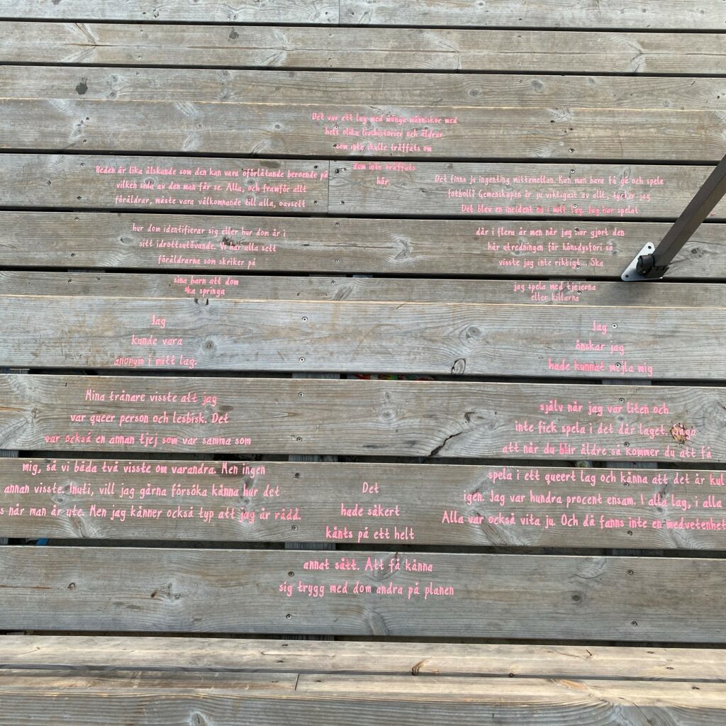 Texterna är utdrag ur intervjuer med queera göteborgare som berättar om sina erfarenheter av bollsport och Heden. Det är berättelser som vittnar om såväl glädje, eufori och gemenskap, som fobi, exkludering och besvikelse. Varje textsnutt bildar formen av en rosa triangel.